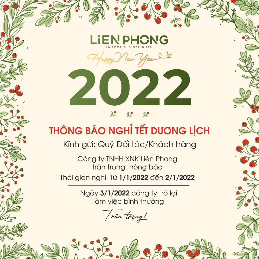 Công ty TNHH XNK Liên Phong xin trân trọng thông báo lịch nghỉ Tết dương lịch 2022