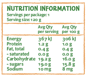 Thành phần: Chuối* (61%), Táo*, Phúc bồn tử* (10%), Chất chống oxy hóa (Axit ascorbic), Chất hoạt chỉnh độ chua (Axit Citric), chiết xuất Vani, *Nguyên liệu đạt chuẩn Organic.