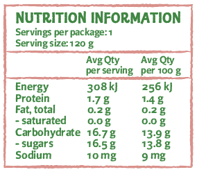 Thành phần: Lê* (36%), Chuối* (28%), Táo* (27%), Nước, Chất chống oxy hóa (Axit ascorbic), Chất hoạt chỉnh độ chua (Axit Citric)*Nguyên liệu đạt chuẩn Organic